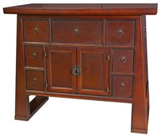 This lovely reddish brown finished cabinet is the perfect size to hold a small television set or other item. Features ample storage space and a unique shape. . Dimensions: 32W x 15D x 26H